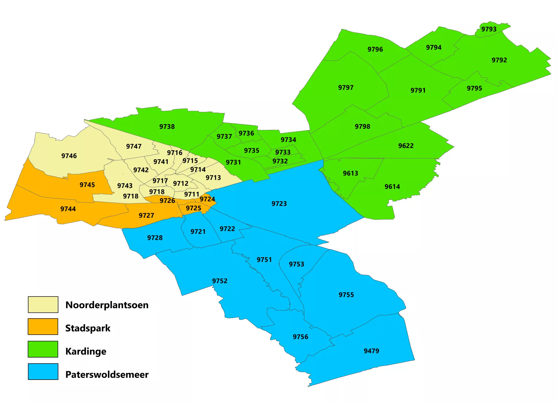 Figuur 1 laat zien welke postcode gebieden aan welk groen gebied zijn gekoppeld. Wanneer een postcode niet herkend kon worden als een postcode (binnen de gemeente Groningen) kregen de respondenten de vragen over Recreatiegebied Kardinge voorgelegd. De respondenten die aangaven nooit het ‘aangewezen’ gebied te bezoeken, kregen nog wel een aantal algemene vragen voorgelegd over de groen gebieden in de stad.