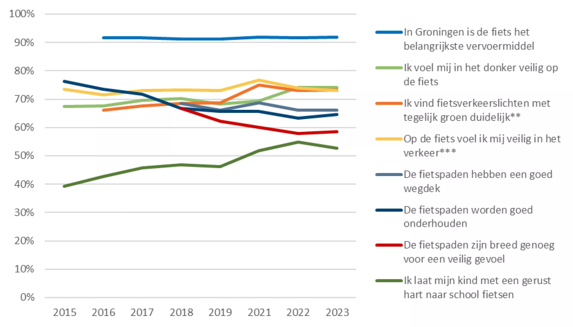 ** Tot en met 2019 werd de stelling “Ik vind fietsverkeerslichten met tegelijk groen onduidelijk” gesteld. In de grafiek zijn voor deze jaren de antwoordopties (helemaal) oneens meegenomen.