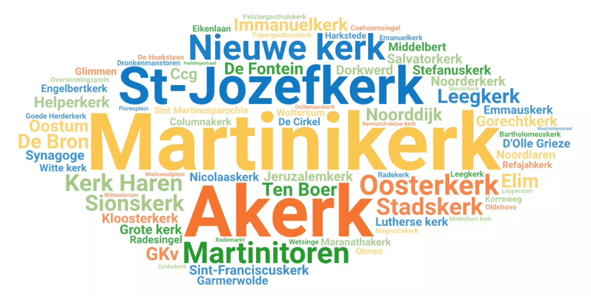 Allereerst vroegen we de panelleden welke kerk als eerste bij hen opkomt als zij denken aan kerkgebouwen in de gemeente Groningen. De uitkomsten hiervan zijn te zien in de woordenwolk (Figuur 1). Het is duidelijk dat de grote kerken in de gemeente het vaakst genoemd zijn. Zo noemden ruim 2.100 respondenten de Martinikerk of -toren, ruim 750 de Akerk en ruim 250 de St-Jozefkerk. Maar ook kleinere kerken in de dorpen worden regelmatig genoemd. In totaal worden zo’n 80 verschillende kerken genoemd.