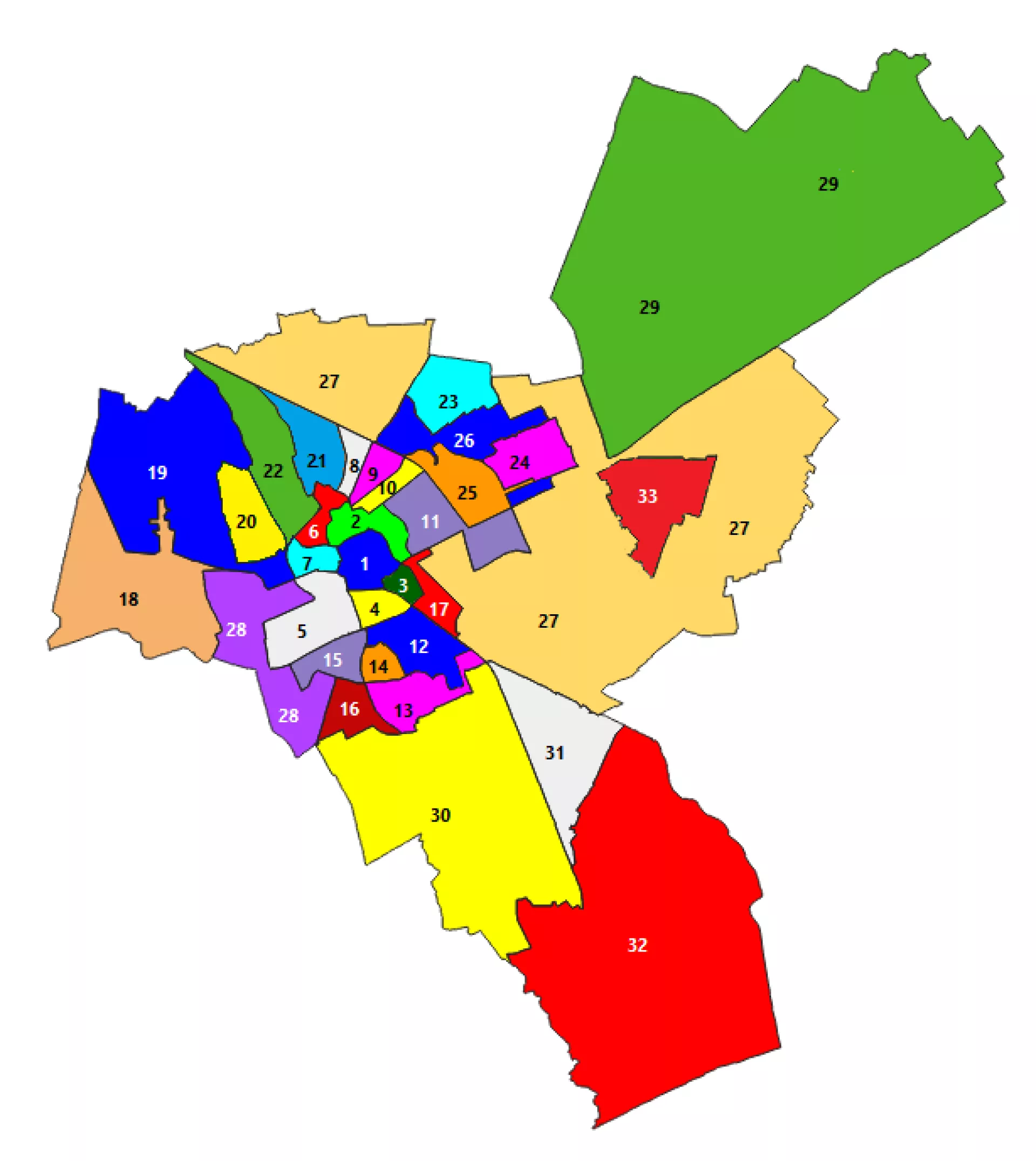 Daarbij wordt een indeling gehanteerd met 33 wijken en dorpen, zie Figuur 3 onder de opgesomde wijken en dorpen.