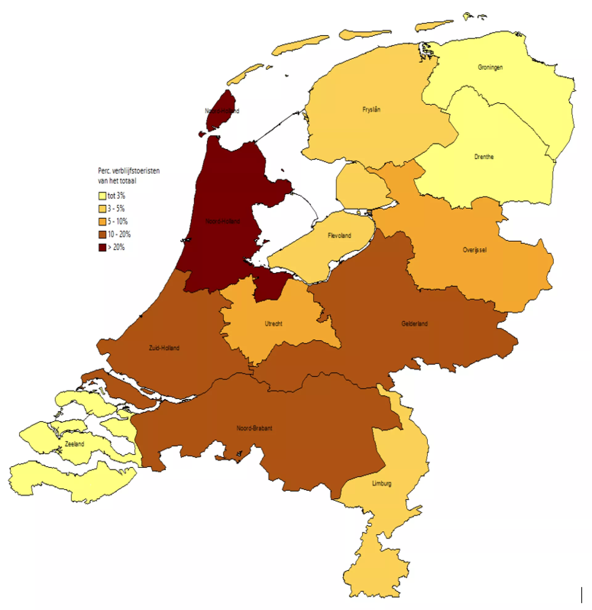 Figuur 3 toont de herkomst van de Nederlandse verblijfstoeristen die in de gemeente Groningen overnachten in het onderzoek van 2023. De meeste verblijfstoeristen komen uit Noord-Holland, Zuid-Holland, Brabant en Gelderland. Vergeleken met voorgaande jaren is er met name een stijging zichtbaar in het percentage verblijfstoeristen uit Flevoland.