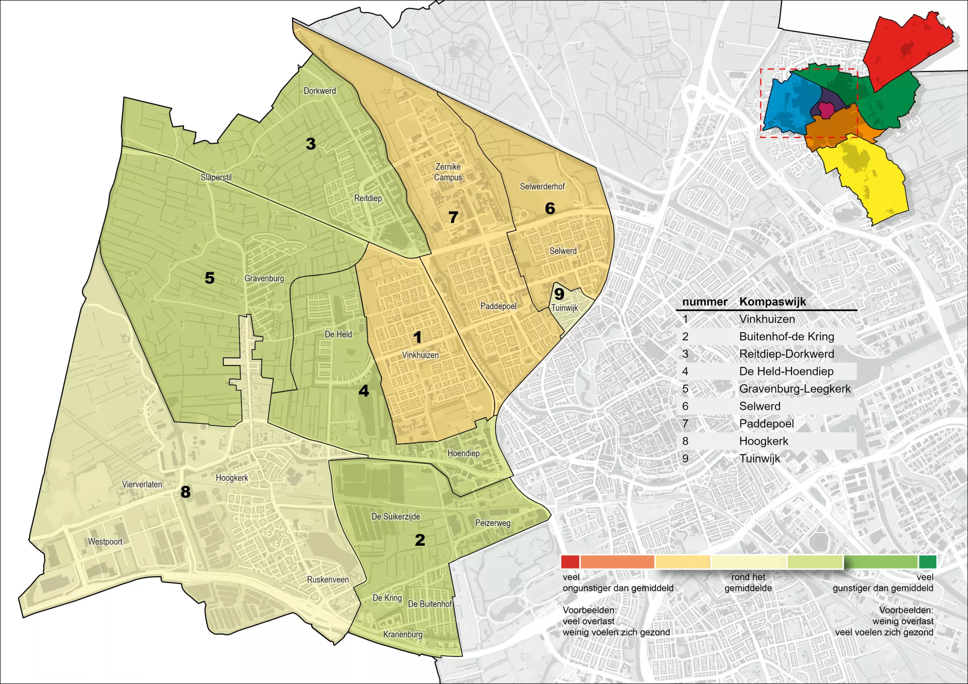 - De lichtgroene kleur van de vier nieuwbouwwijken laat zien dat de situatie in deze wijken over het geheel iets gunstiger is dan gemiddeld binnen de gemeente. De situatie in de oude stadswijk Tuinwijk en het dorp Hoogkerk is gemiddeld (geel). In de oude buitenwijken, onderdeel van de ‘noordelijke wijken’, is de situatie ongunstiger (lichtoranje).