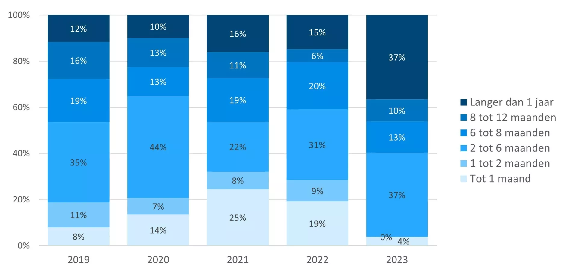 Eerder veronderstelden we dat een teruglopende uitstroom tot een verlengd verblijfsduur kan leiden. In figuur is de verblijfsduur weergegevens van personen die uitstromen uit de crisisopvang. Terwijl in 2019 nog 12% van de personen uitstromen na een verblijf van meer dan 1 jaar neemt dit aandeel toe tot 37% van de personen die in 2023 uitstromen.