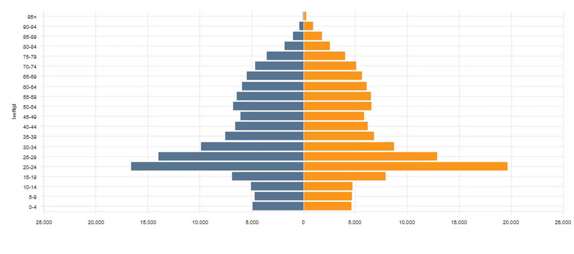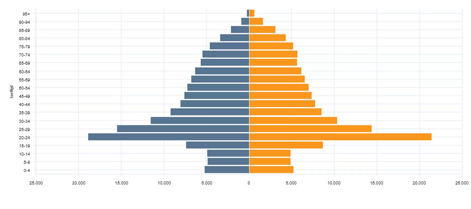 Links is de bevolkingspiramide voor 2023 te zien, rechts de verwachte bevolkingspiramides voor 2043. In de huidige piramide (2023) zijn de leeftijdsgroepen 0-4 jaar, 5-9 jaar en 10-14 jaar relatief kleiner dan de overige leeftijdsjaren (m.u.v. de leeftijdsgroepen van 70 jaar en ouder). Groningen als een echte studentenstad is zichtbaar in de leeftijdsgroep 20-24 jaar die de grootste groep vormt. In 2043 ziet de bevolkingspiramide in Groningen er iets anders uit dan in 2023. Met uitzondering van de 10-14 jarige jongens zijn alle leeftijdsgroepen tegen die tijd in omvang toegenomen. De meest omvangrijke groep vinden we nog steeds in de leeftijdsgroep 20-24 jaar.