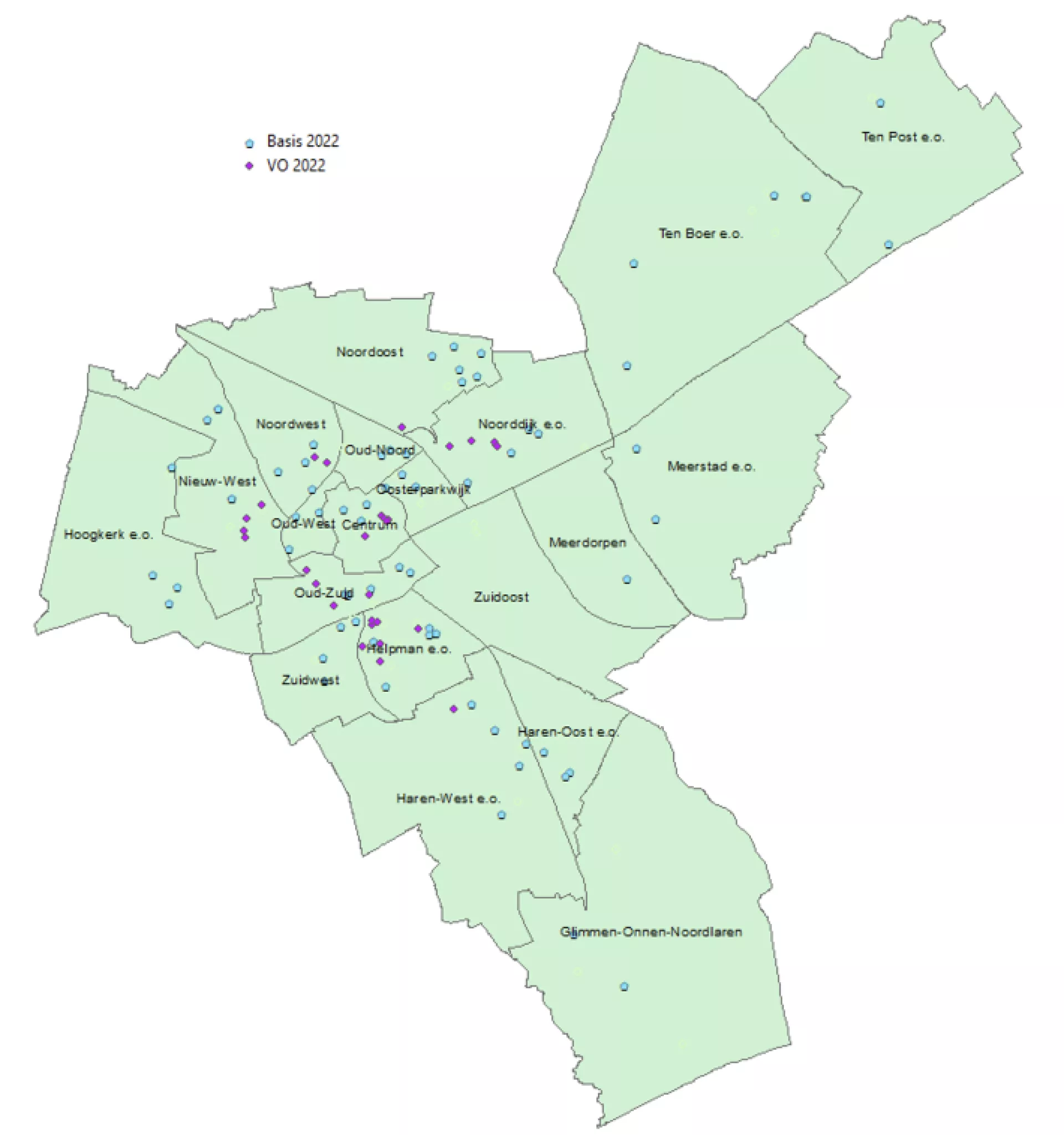 De gemeente Groningen telt in 2022 in totaal 55 basisscholen en 22 voortgezet onderwijsscholen. Zie figuur 1 voor een visuele weergave van de standplaats van de scholen.