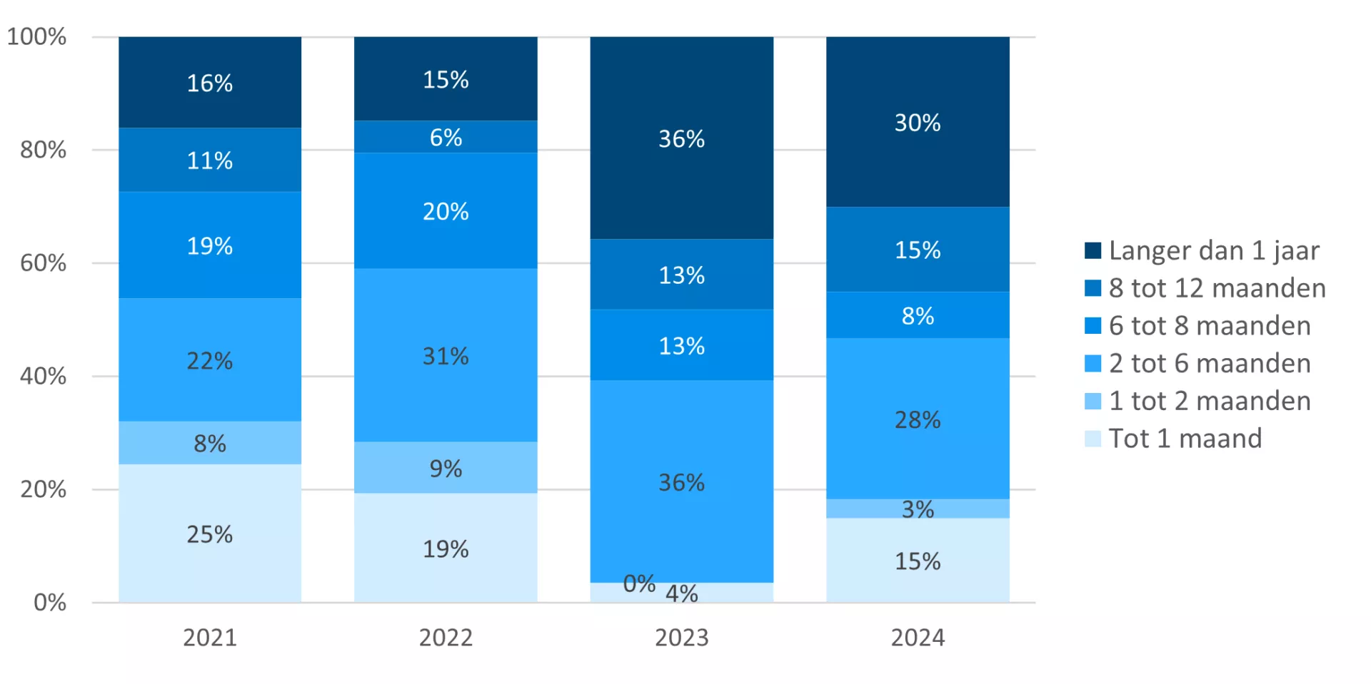 Eerder veronderstelden we dat een teruglopende uitstroom tot een verlengd verblijfsduur kan leiden. Om dit te illustreren is in figuur 1 de verblijfsduur weergegeven van personen die uitstromen uit de crisisopvang. Terwijl in 2021 nog 16% van de personen uitstromen na een verblijf van meer dan 1 jaar neemt dit aandeel toe tot 36% van de personen die in 2023 uitstromen en 30% in 2024.