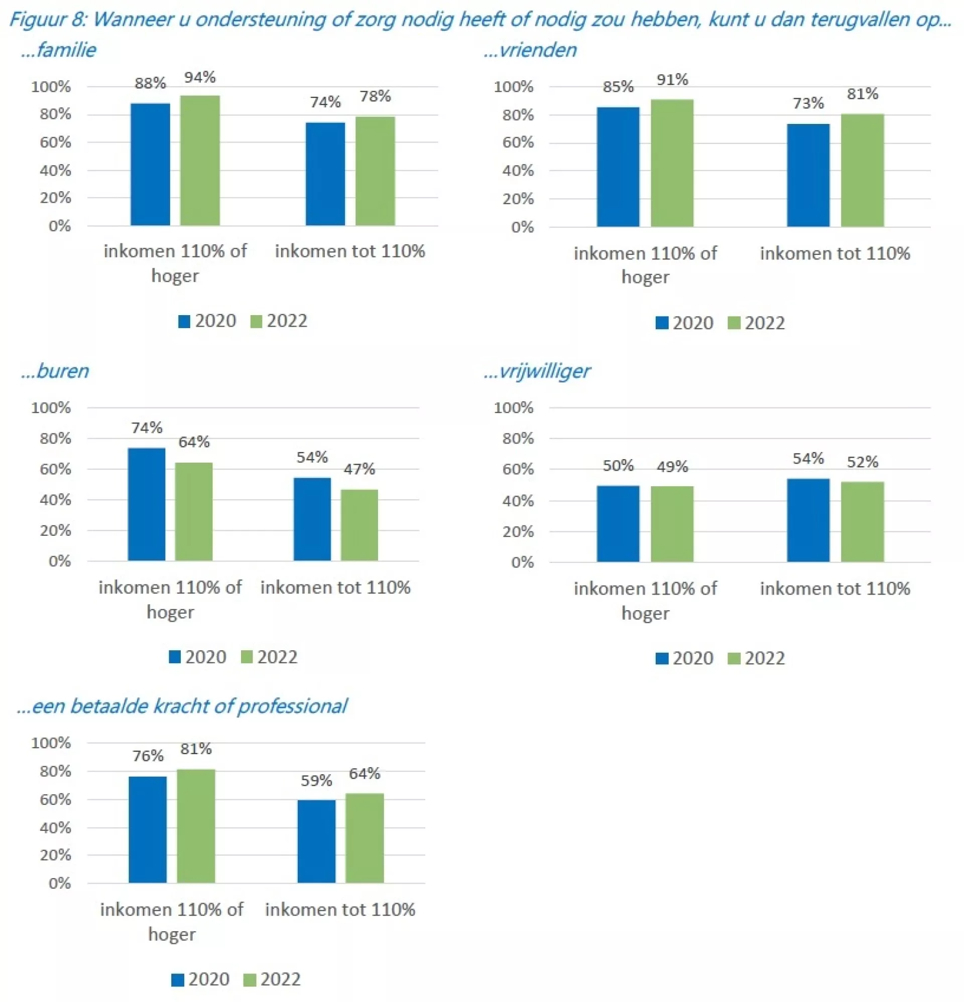 Het kunnen terugvallen op familie, vrienden en professionals is in 2022 bij zowel de hogere als lage inkomensgroepen gestegen ten opzichte van 2020. Opvallend is de afname bij beide groepen in het terug kunnen vallen op buren. Bij hogere inkomens is deze afname het grootst (10 procentpunt, ten opzichte van 7 procentpunt bij lage inkomens). De coronacrisis kan hier een mogelijke verklaring voor zijn; toen was het dagelijkse leven ruimtelijk beperkter en waren mensen meer aangewezen op hun directe omgeving.