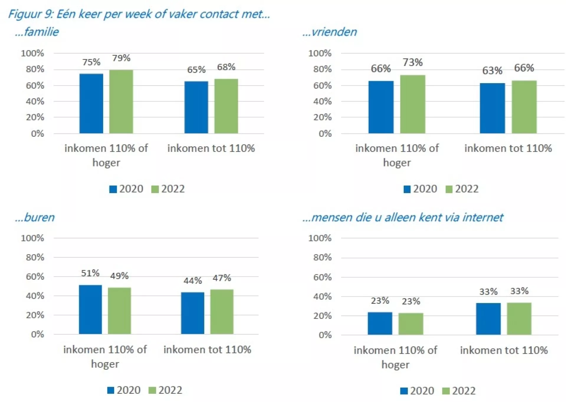 Sociale contacten zijn belangrijk voor het welzijn. Ze bieden emotionele steun, bevorderen een gevoel van verbondenheid en dragen bij aan de kwaliteit van leven. In de leefbaarheidsenquête is gevraagd naar hoe vaak men contact heeft met verschillende soorten mensen, zoals familie, vrienden en buren. Wanneer we deze resultaten uitsplitsen naar respondenten met een laag en hoger inkomen, dan blijkt dat de eerste groep minder vaak contact heeft met familie; 68% heeft minimaal een keer per week contact, van de hogere inkomens is dit 79% (figuur 9). Ook vrienden zien mensen met een laag inkomen minder vaak: 66%, ten opzichte van 73% van de hogere inkomens. Bij de overige groepen (buren en andere inwoners van de gemeente) zit er nauwelijks verschil tussen hogere en lage inkomens. Inwoners met een laag inkomen hebben juist vaker contact met mensen die zij alleen kennen via internet (33% versus 23%). Tussen 2020 en 2022 zien we bij lage inkomens kleine verschillen in het contact met familie, vrienden en buren; in 2022 is er telkens iets vaker contact met deze groepen mensen. Deze verschillen zijn er ook bij hogere inkomens. Alleen het contact met buren daalde licht bij deze groep. Het CBS (2023) vindt in zijn onderzoek andere resultaten en ziet weinig verschil tussen hoge en lage inkomens in de mate van contact met andere mensen.