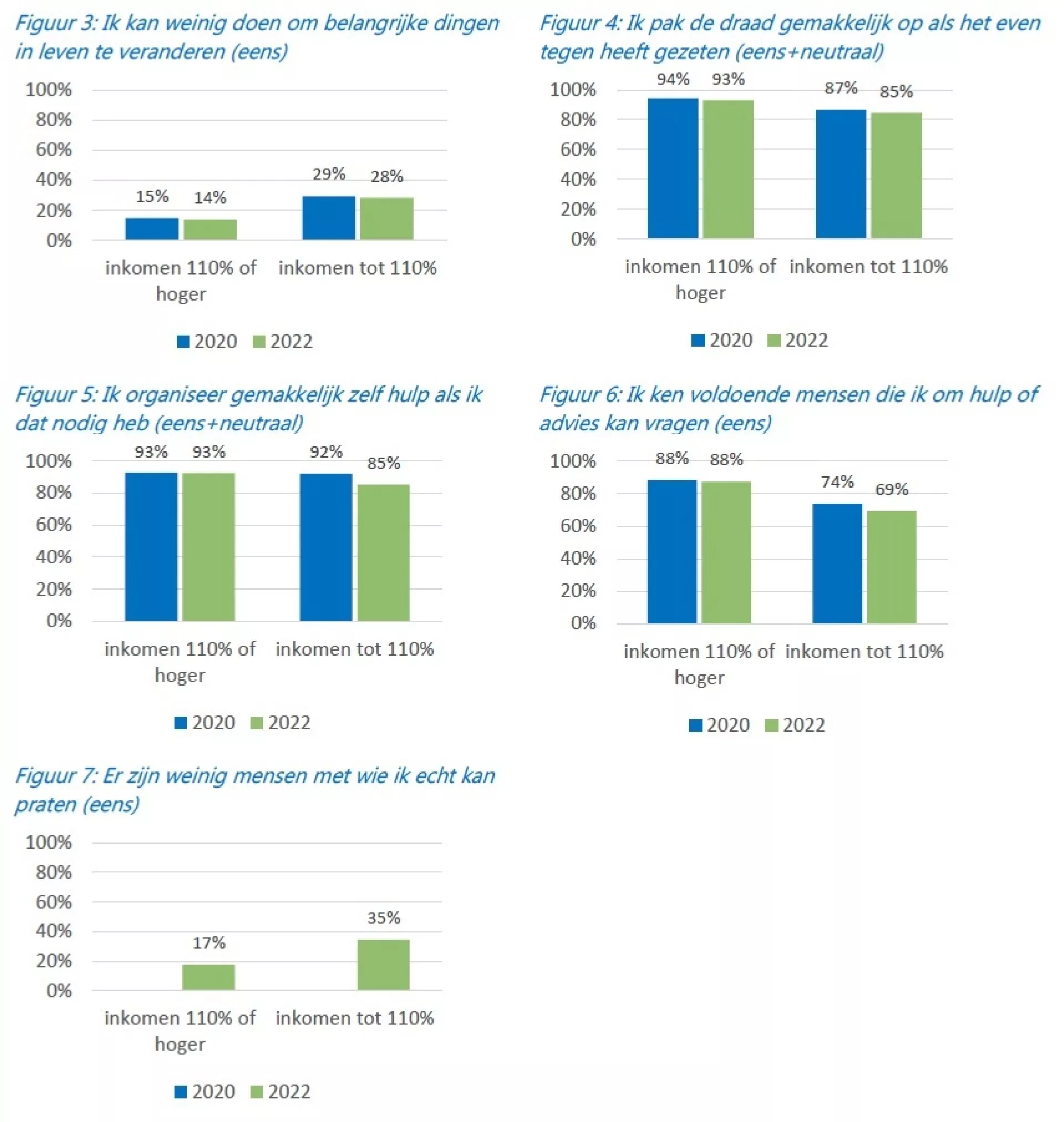 Daarnaast luiden twee stellingen rond dit thema: ‘ik pak de draad gemakkelijk op als het even tegen heeft gezeten’ en ‘ik organiseer gemakkelijk zelf hulp als ik dat nodig heb’ (figuur 4 en 5). Beide stellingen hebben vergelijkbare uitkomsten. Van de inwoners met een laag inkomen antwoord 85% beide stellingen met (helemaal) eens of neutraal. Van inwoners met een hoger inkomen is dat 93%. Als het gaat om makkelijk de draad oppakken zijn de resultaten voor zowel lage als hogere inkomens vergelijkbaar in de jaren 2020 en 2022. In 2022 zijn de percentages voor beide groepen met 1 à 2 procentpunt gedaald. Het aandeel inwoners met een laag inkomens dat zelf hulp weet te organiseren is in 2022 iets gedaald ten opzichte van 2020. In 2020 was dit voor lage inkomens nog 92% en daarmee vergelijkbaar met het aandeel hogere inkomens dat zelf hulp kan organiseren. Het aandeel hogere inkomens dat aangeeft zelf hulp te kunnen organiseren is in deze periode niet gedaald.