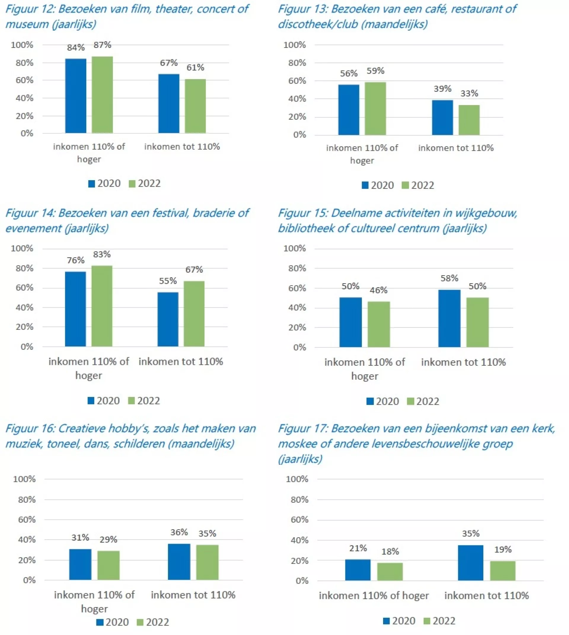 Verder kan de deelname aan verschillende activiteiten iets zeggen over de mate van meedoen in de samenleving. De figuren 12 tot en met 17 geven een overzicht van de deelname aan en het bezoeken van verschillende activiteiten. Hier springen vooral de verschillen in het bezoeken van een café, restaurant of discotheek/club en film, theater, concert of museum eruit. In beide gevallen is het verschil 26 procentpunt tussen inwoners met een laag en hoger inkomen. Ook festivals, braderieën of evenementen bezoeken respondenten met een laag inkomen een stuk minder (67% minimaal een keer per jaar, tegenover 83% van de hogere inkomens). We zien dat bij al deze activiteiten geldt: hoe langer een laag inkomen, hoe minder mensen dit doen. De verschillen zijn vermoedelijk te verklaren door de kosten die met de meeste van deze activiteiten gepaard gaan. Tussen 2020 en 2022 zien we bij hogere inkomens het bezoek aan film, concerten en horeca stijgen, terwijl er bij lage inkomens een daling te zien is. Bij lage inkomens zien we juist wel een stijging bij het bezoeken van festivals en evenementen. Deze stijging is groter dan de stijging bij hogere inkomens. Toch blijft het verschil tussen lage en hogere inkomens hier vrij groot.