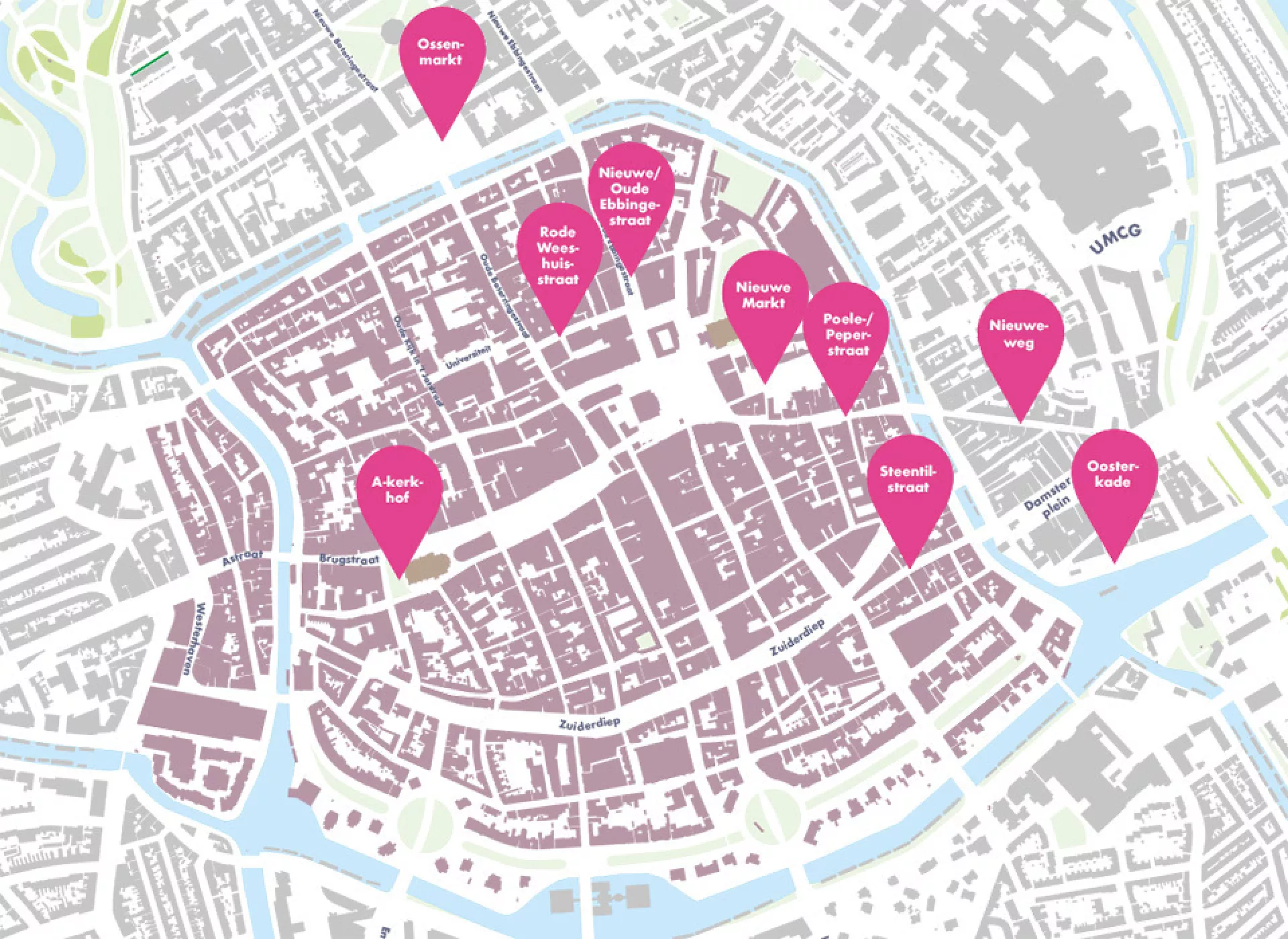 De gemeente Groningen werkt dagelijks aan het verbeteren van de leefkwaliteit in de binnenstad. Daarbij richt de gemeente zich medio 2025 op een aantal specifieke plekken. Deze plekken zijn weergegeven in onderstaande kaart (figuur 19).